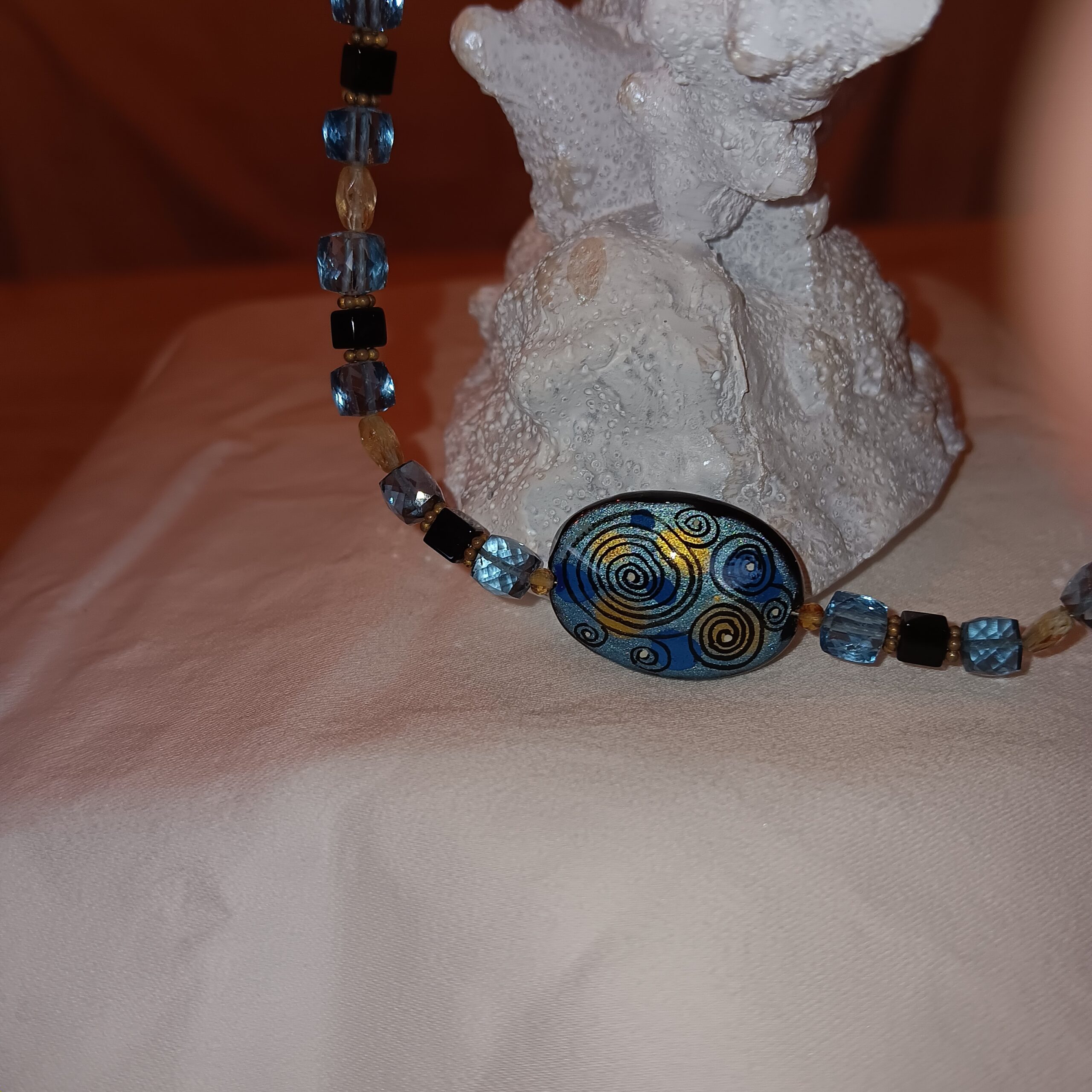 My materials come primarily from the Tucson Gem and Mineral show where I have access to beads and other components from around the world.