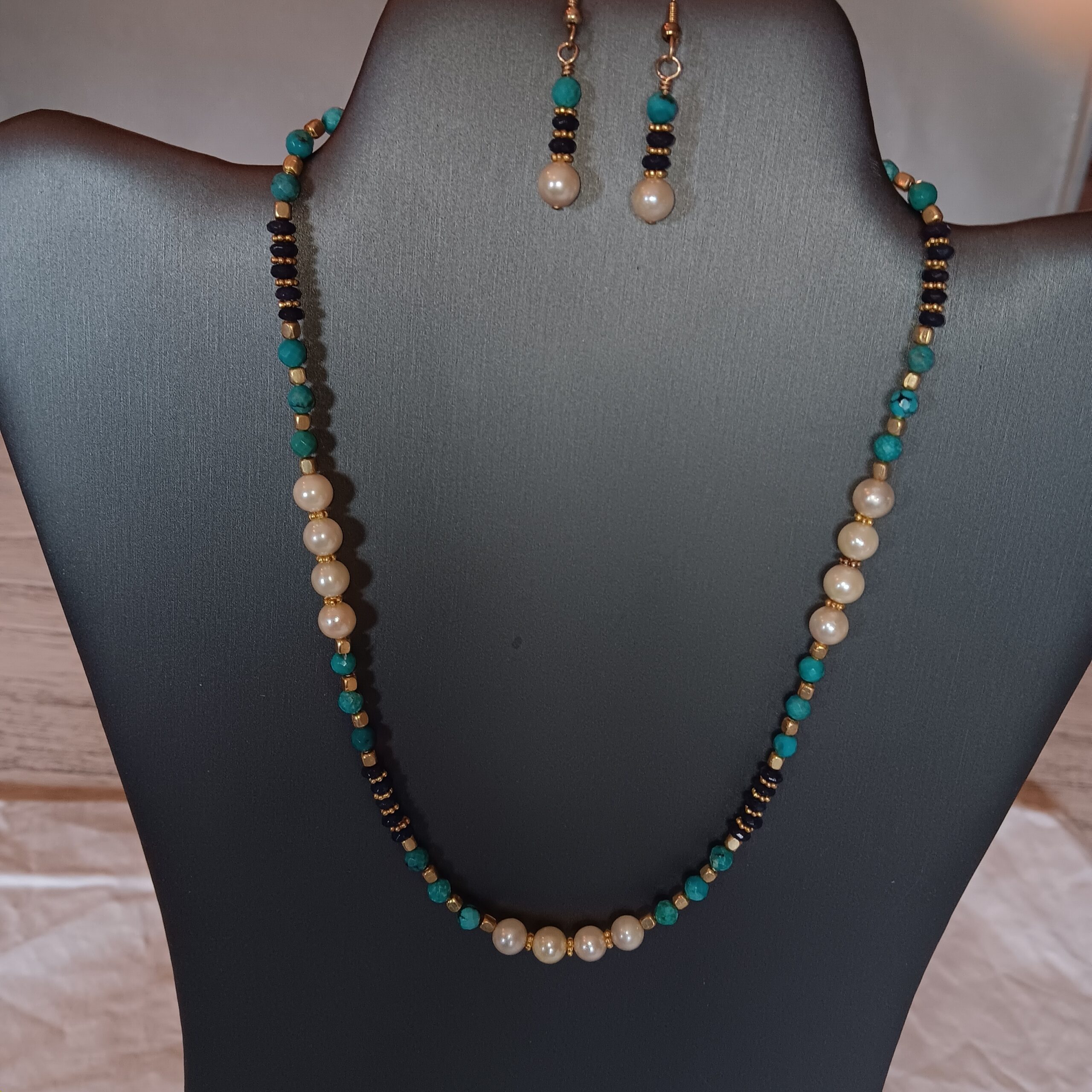 Pearls, turquoise, and sapphire beads. Gold plated components.