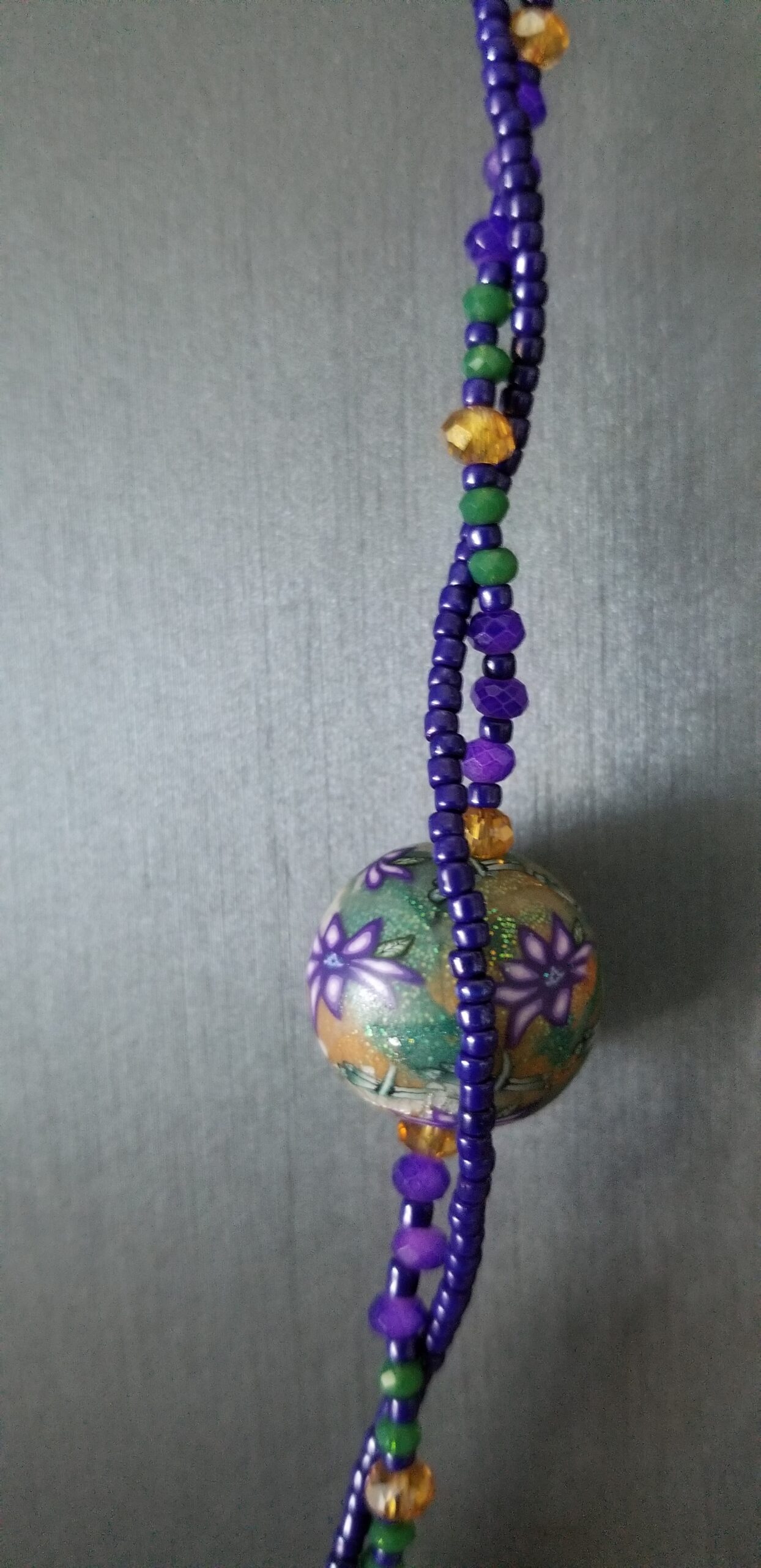 Interesting array of polymer beads with total of  2 strands of complementing seed beads and crystals.  Long length.  Incredible detail in polymer beads.  Each bead somewhat different.  Complementing colors include purple as primary, gold green, and light purple.  A stunning piece with intricate detail.  Finished with sterling end caps and clasp.