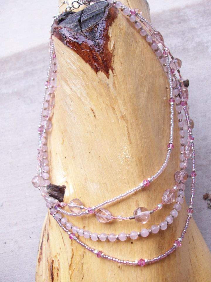 4 strand necklace with all kinds of individual beads in various shades of pink. Beads include rose quarts, shaped glass leaves, round, but wavy glass, seed beads, sterling silver, Swarovski and Austrian crystals. Earrings $15 and are matching the pink glass wavy glass beads in necklace. $15. Glass leaf earrings and pink quartz also available for $15. Toggle clasp, but can be changed and lengthened if too short.