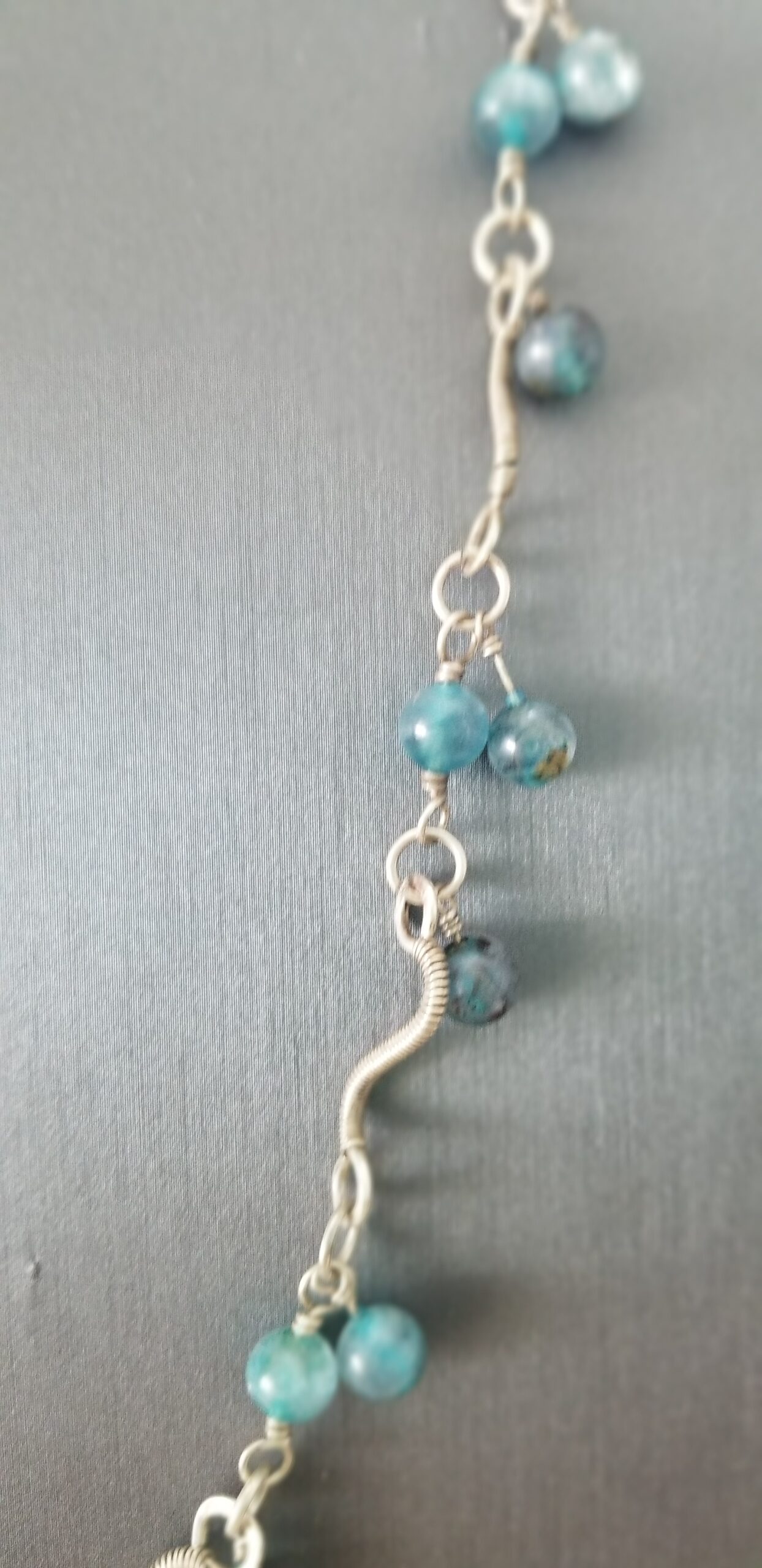 Incredible necklace with EXTENSIVE wire work links and beads of Apatite. Apatite droplets. Beautiful teal of Apatite. Single drop earrings to match 12$ separately. This design took approximately 20 hours to create over days since pulling the wire would fatigue my hands. All wire is sterling . I love the outcome!