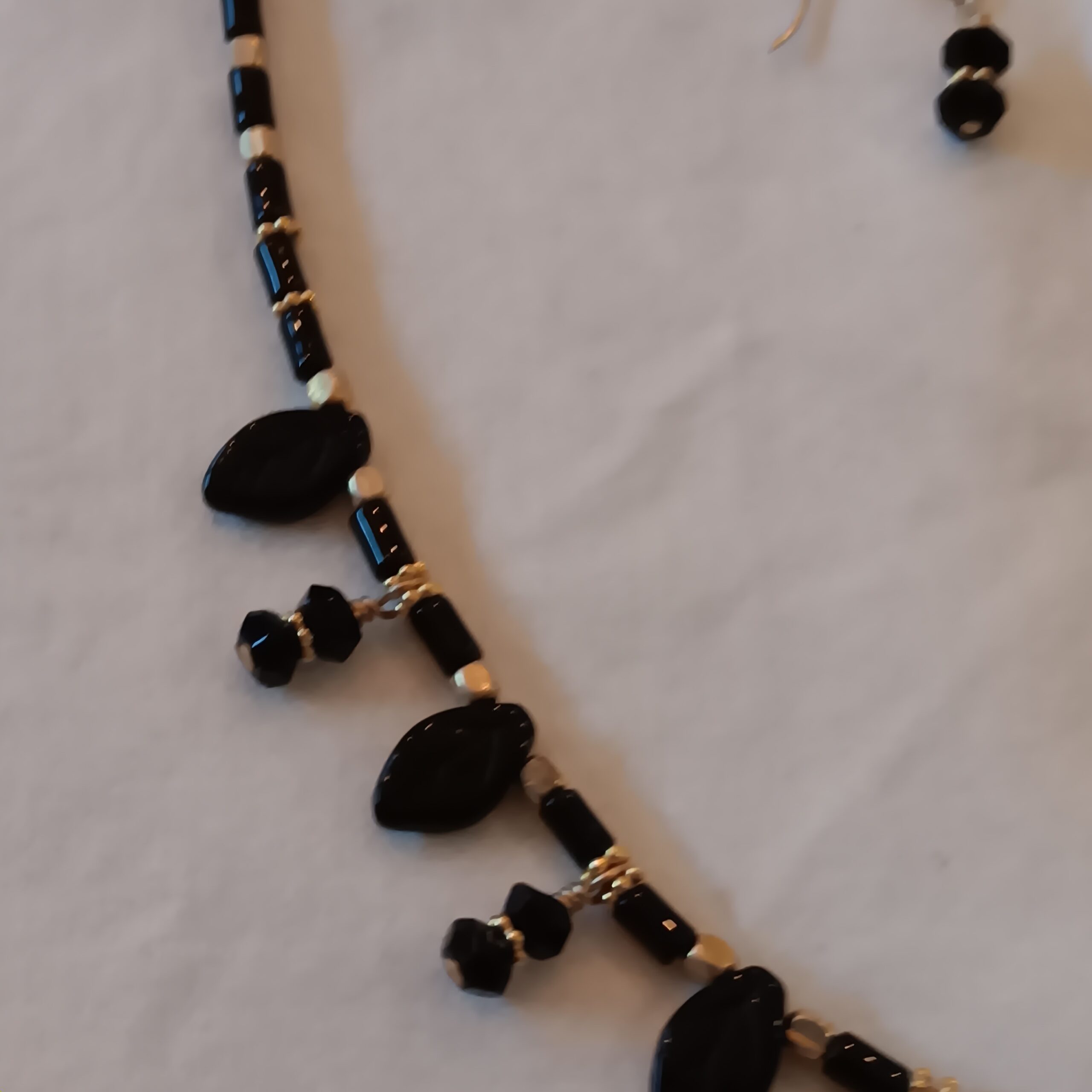 Attractive necklace of black beads and gold filled spacers and clasp. Hand wired droplets adorn the front of the necklace featuring stacked black faceted rondelles w/ g.f. spacers and black glass ‘leaves’. Necklace $55 Matching earrings $15