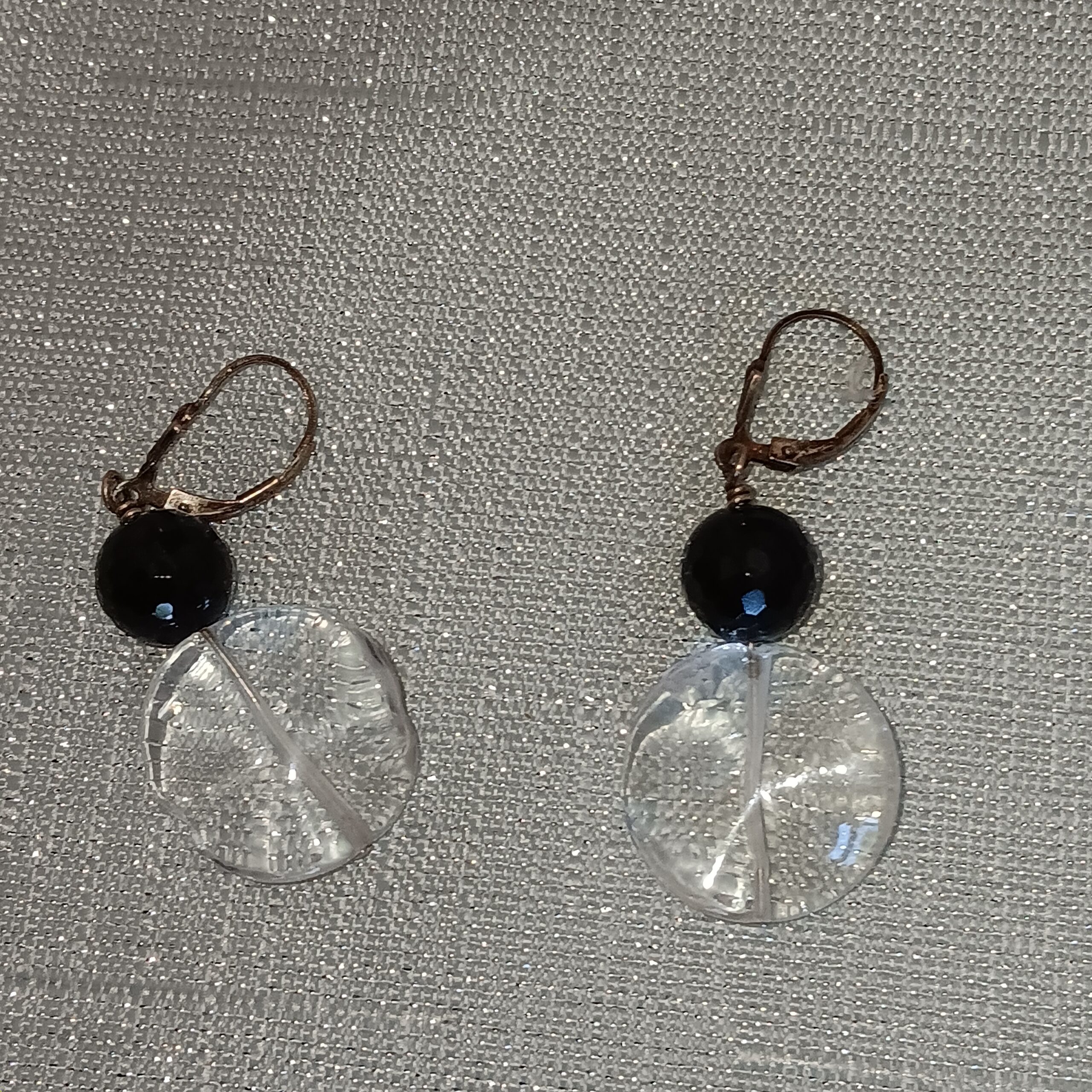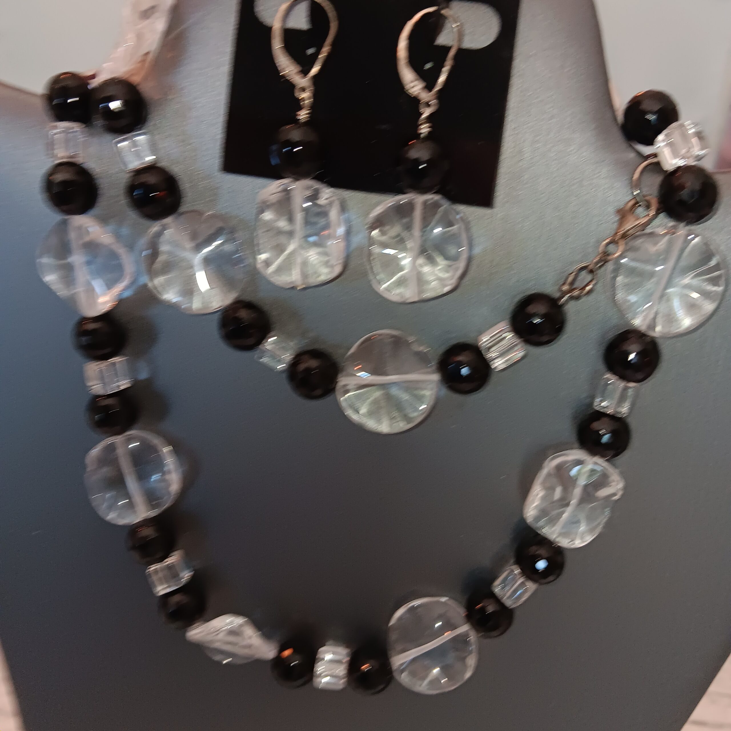 Long necklace of wavy clear glass, clear glass cubes and black bead accents. $45 Classic accent piece. Earrings to match. $18