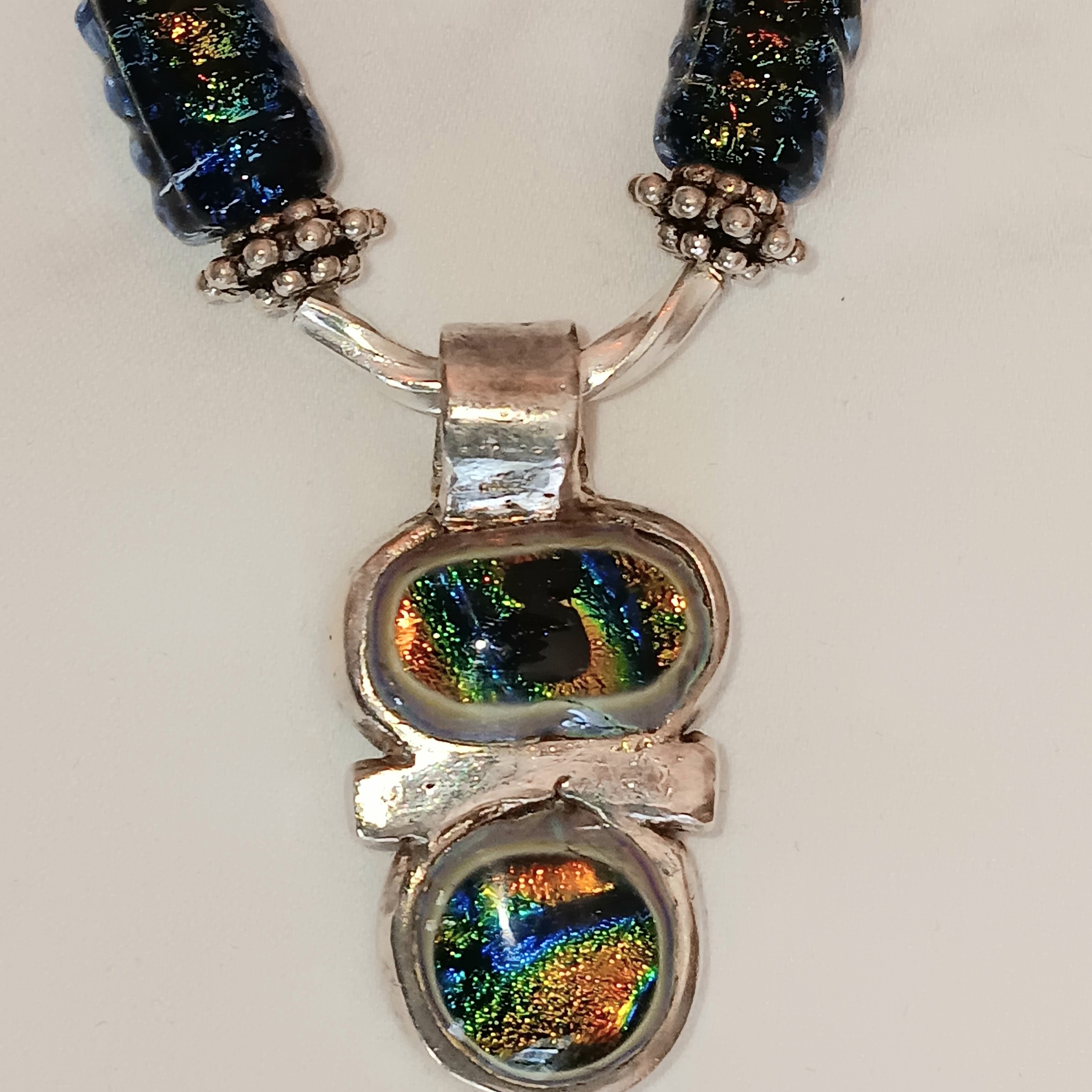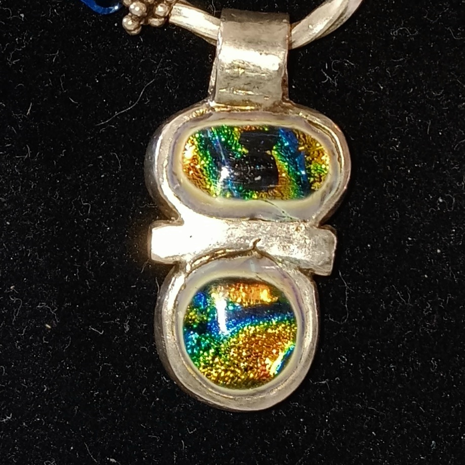 Unusual Art Clay pendant with dichroic glass in 2 separate portions. Necklace of dichroic tube glass. Spacers of beads in accenting colors. All dichroic glass radiates colors of blues, greens, golds and yellow. Take a look at the close-ups to see all the colors. Especially bright in sunlight. Earrings $20