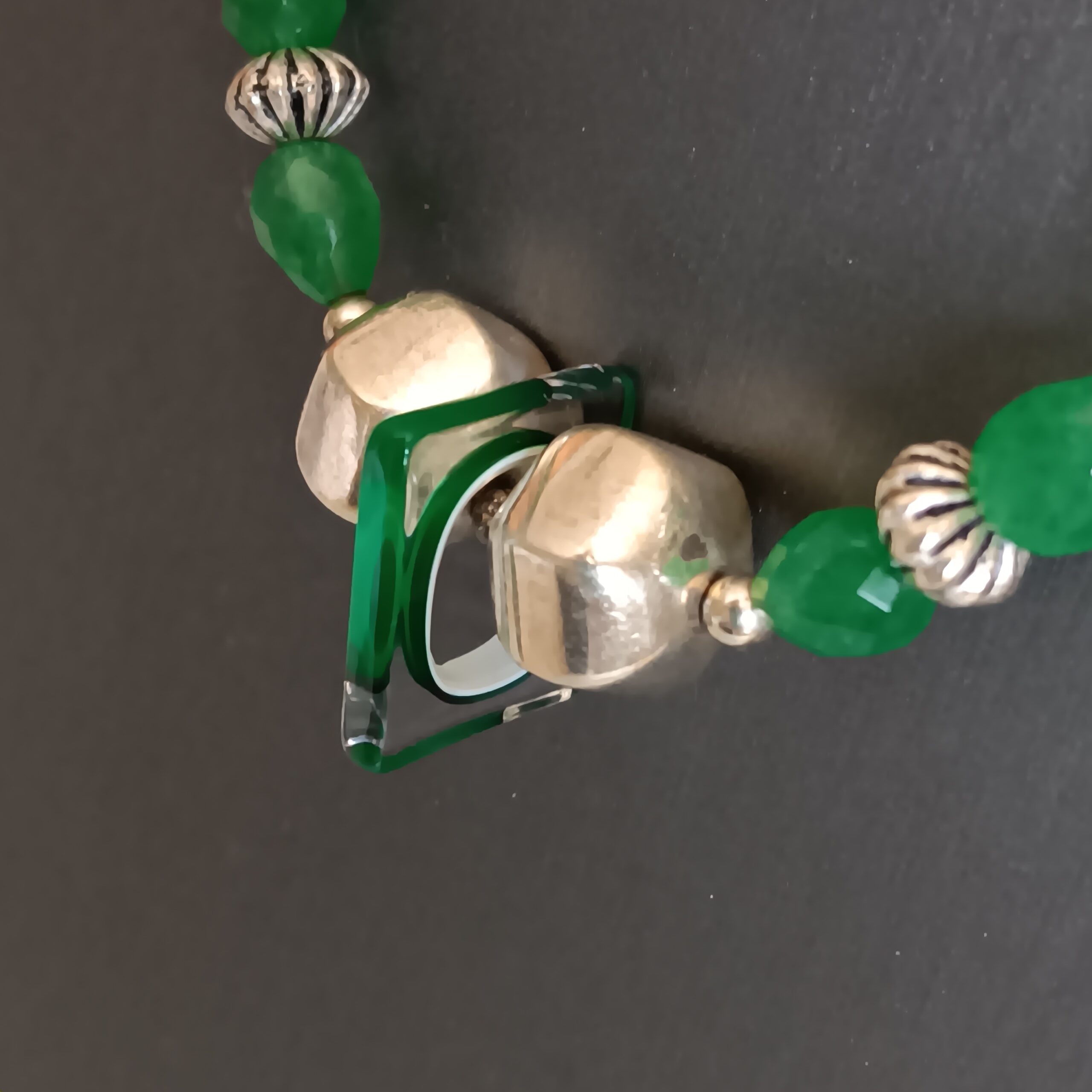 Deep green jade forms the basis of this complex necklace. There are lots of sterling accents with 2 especially large irregular pieces in the front surrounding a piece of green furnace glass. Many different pieces of sterling accents. Earrings are green jade and matching silver accents to those in necklace. Earrings $18