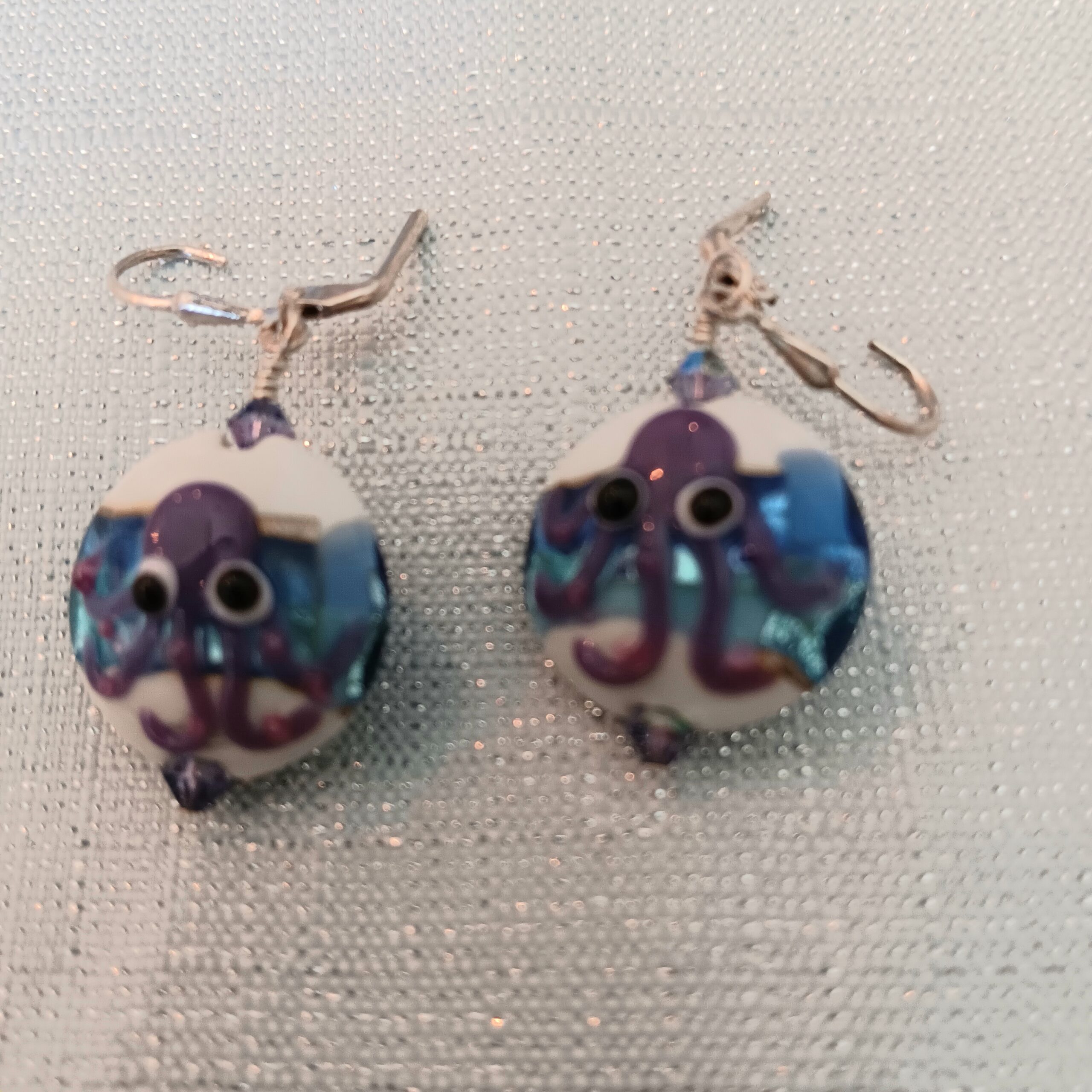 Octopus lamp work bead pendant on necklace of blue and purple clear faceted crystals. Earring same as necklace lamp work pendant. Very fun, whimsical set Earrings $30