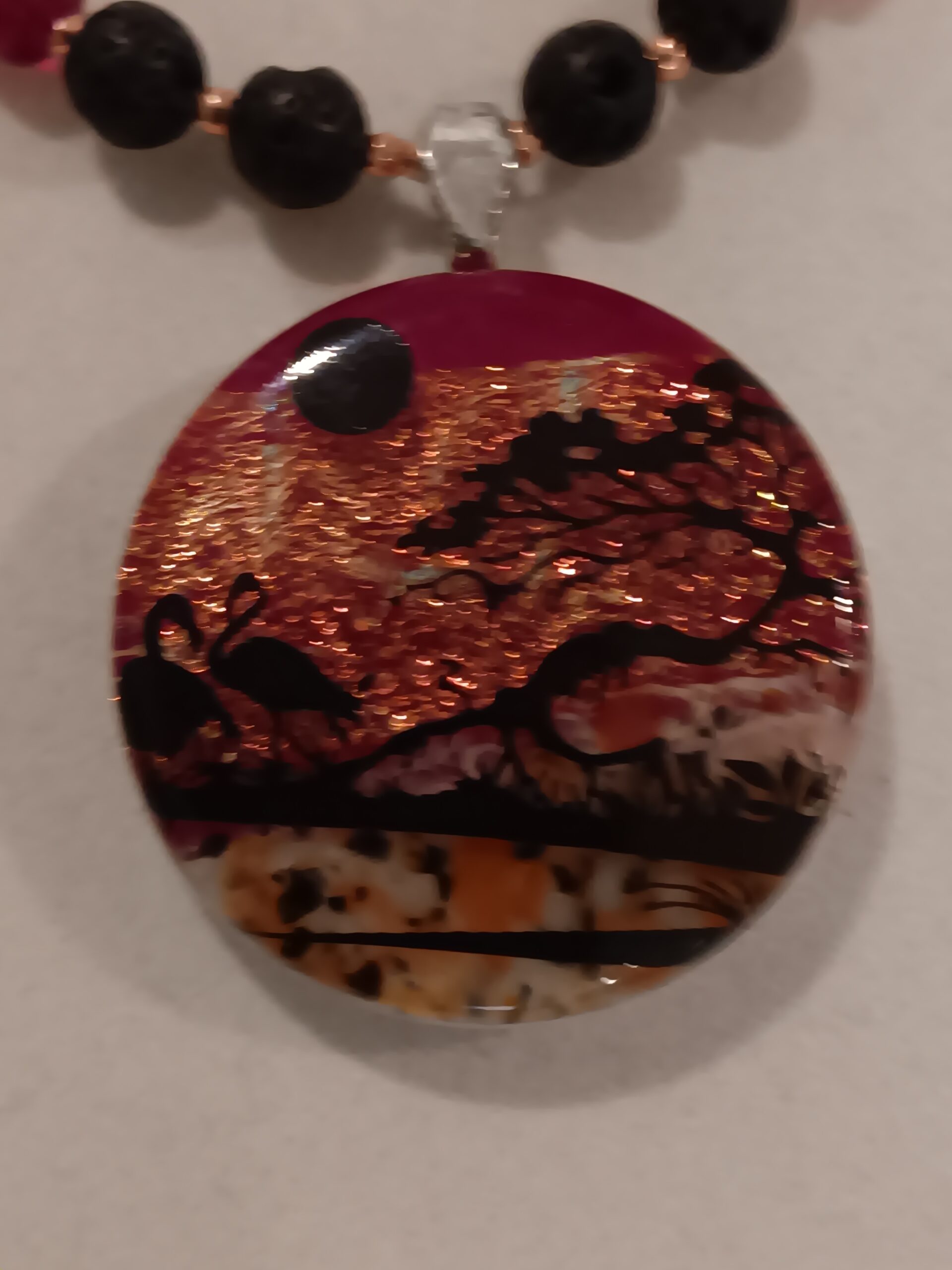 Red and black necklace with ultra detailed pendant. See photos for details of the scene. Pendant manufactured. Necklace longer length. Copper spacers and clasp.