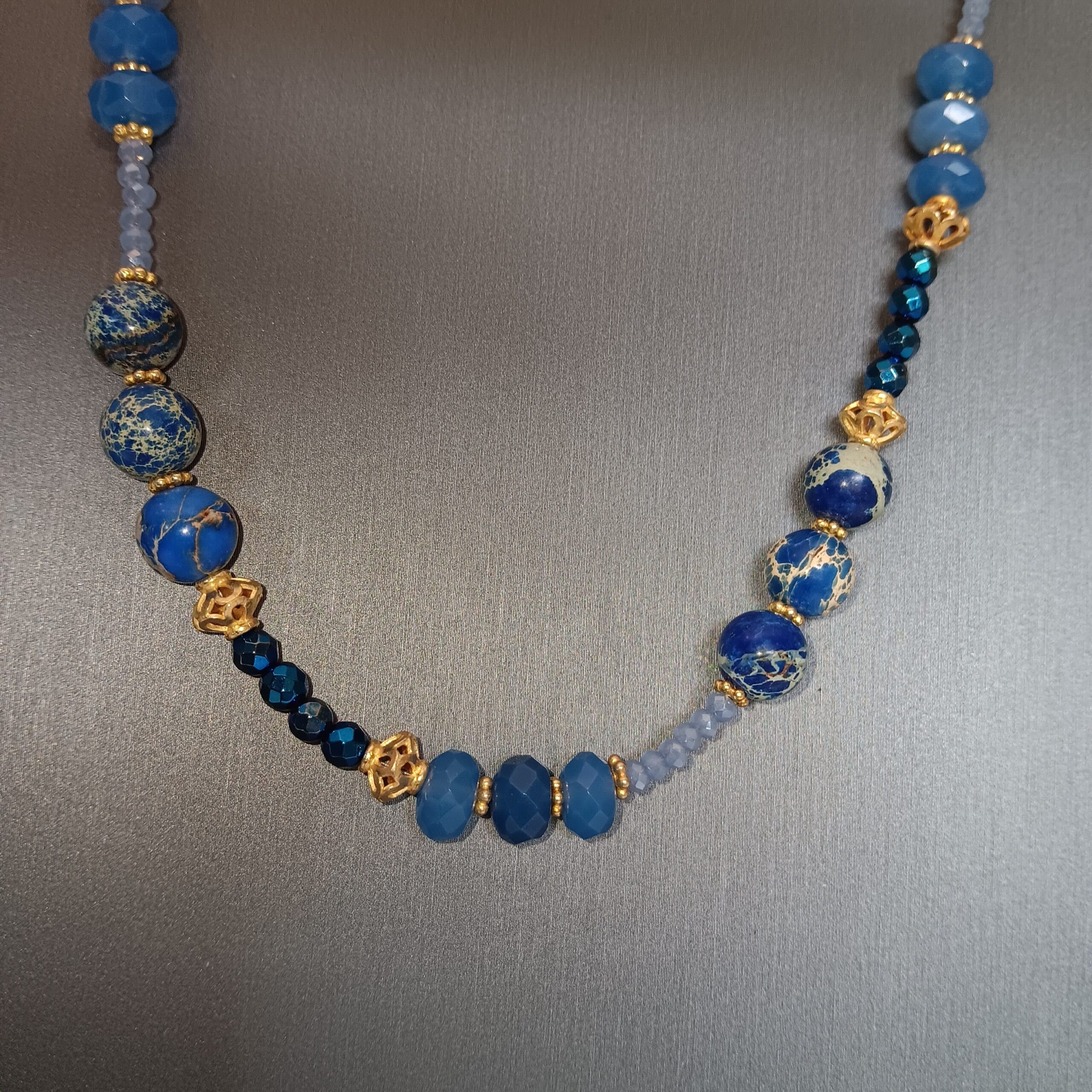Sea sediment jasper, sapphires, aquamarine necklace and gold plated accents